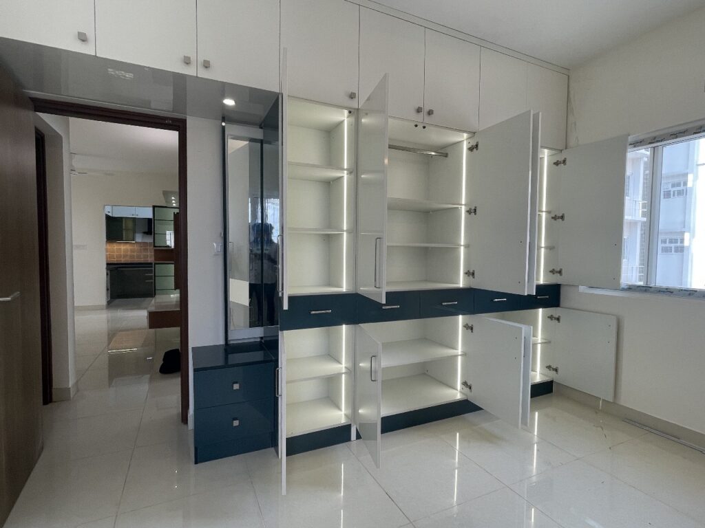Storage is almost always underplanned in new apartments. Flairwood's storage solutions — sliding wardrobes, hinged wardrobes, lofts, utility zones, and walk-in configurations — are engineered for both capacity and longevity. All custom carpentry uses BWR (Boiling Water Resistant) or marine-grade plywood for structural elements, ensuring the furniture holds up well in Bengaluru's humid monsoon seasons.